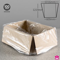 Heavy duty polythene bags with expandable side gussets for added bag capacity. Made from 100 micron (400 gauge) polythene, these extra thick bags bags can be used as packing bags or as box or crate liners for a range of heavy or bulky items. The bags protect contents from moisture and dust, providing greater tear-resistance and durability than your average polythene bag.